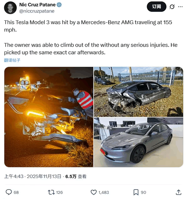 | 原创声明:本文根据海外博主爆料及公开信息整理,客观陈述事件,观点仅代表个人。 2025年11月13日,海外社交媒体炸了——一辆奔驰AMG以时速250公里(155英里)狂飙时,直接撞上一辆特斯拉Model 3的右后侧。现场照片惨烈:Model 3后轮飞了,车尾塌得像被捏瘪的易拉罐,防撞梁都支棱在外头。但离谱的是,车主居然自己爬出车厢,拍拍灰转身又订了台一模一样的车!